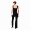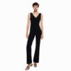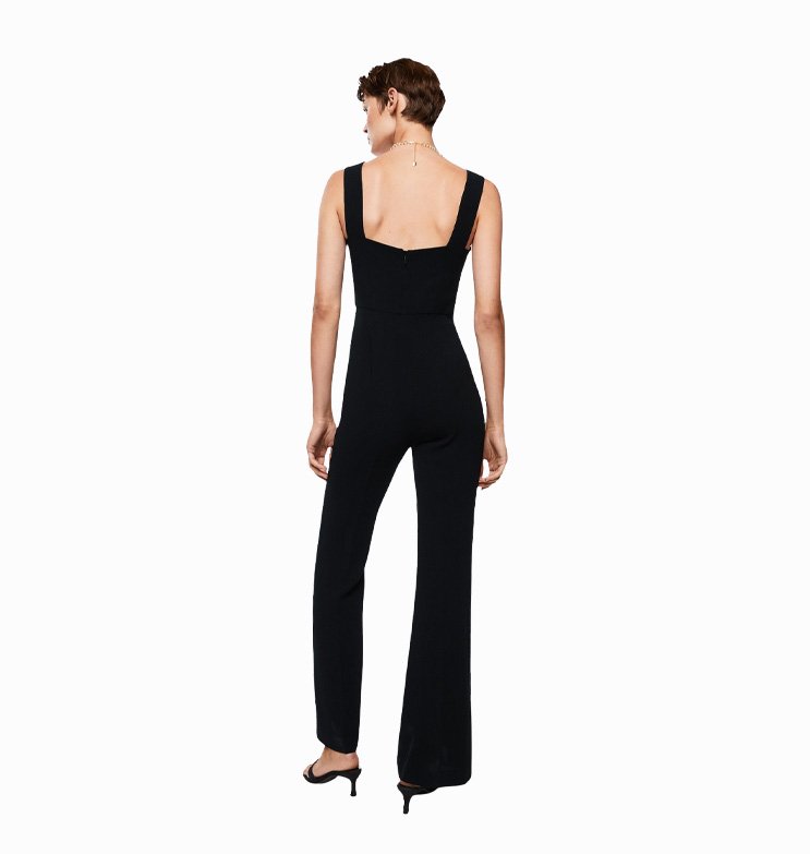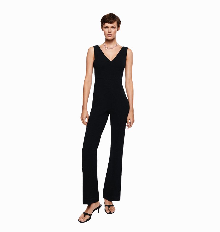 Mot. kombinezonas, juodos spalvos, be rankovių, gili V formos iškirptė, užsegimas užtrauktuku, tiesaus kirpimo, storos šleikutės.