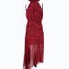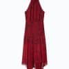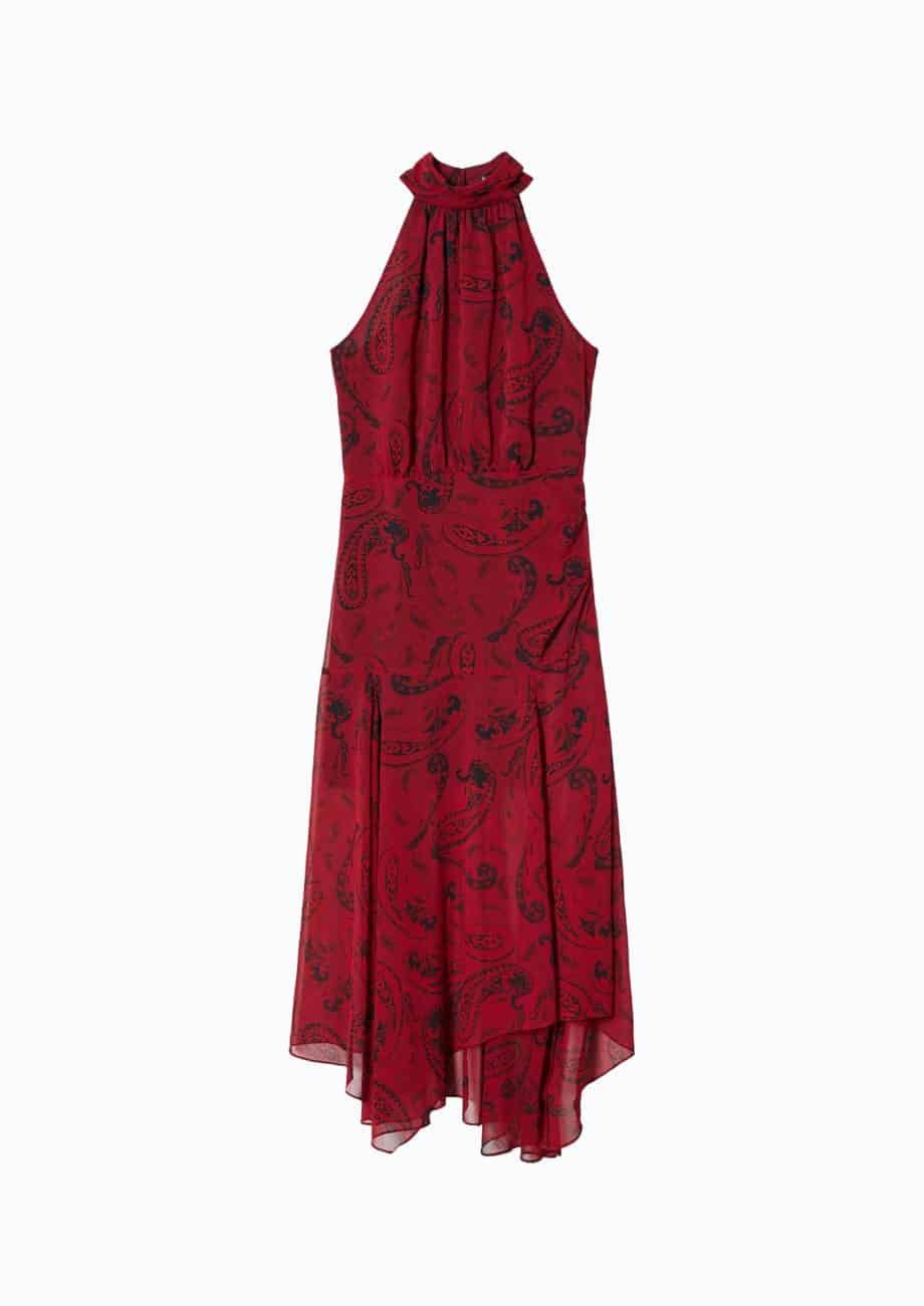 Mot. suknelė, raudonos spalvos, be rankovių, kaklo užsegimas, asimetriški krašteliai, vidinis pamušalas, ilgas dizainas, užsegimas šoniniu užtrauktuku.