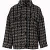 Mot. striukė, tiesus kirpimas, audimo raštas, atlenkiama apykakle, užsagstomas, kišenės ant krutinės.