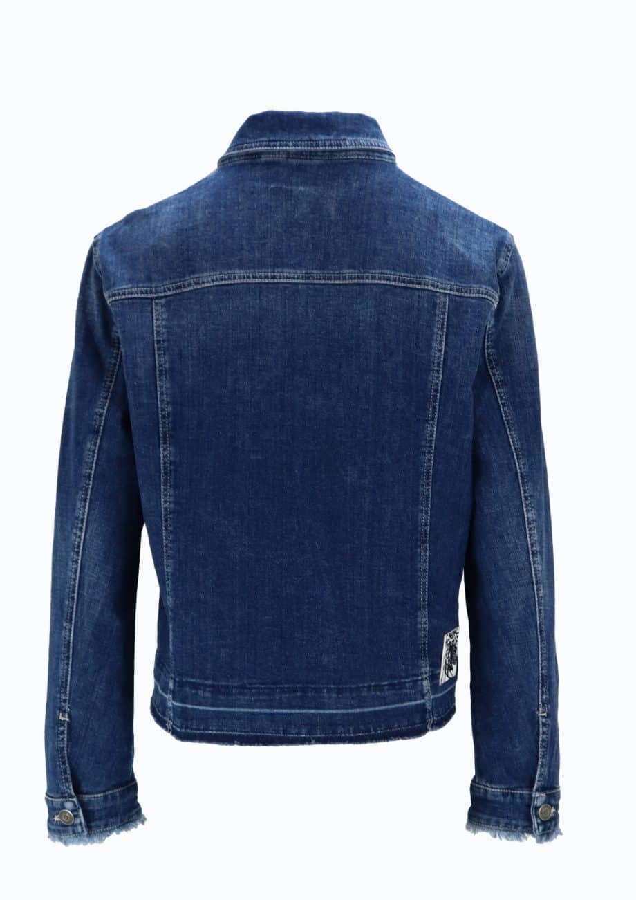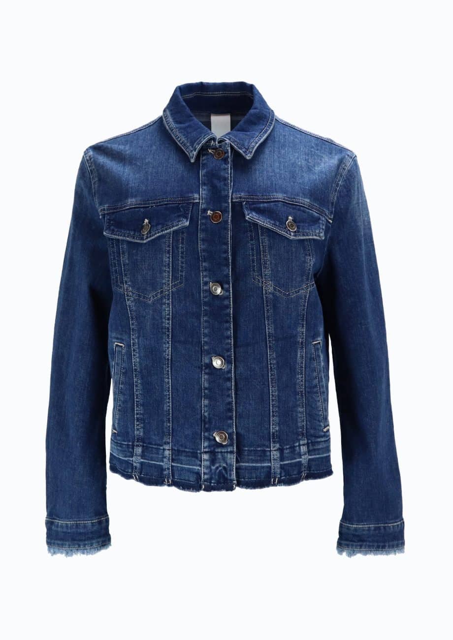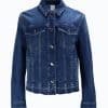 Mot. džinsinis švarkelis, mėlynos spalvos, ilgomis rankovėmis, atlenkiama apykaklė, užsegimas sagomis, su kišenėmis.