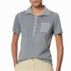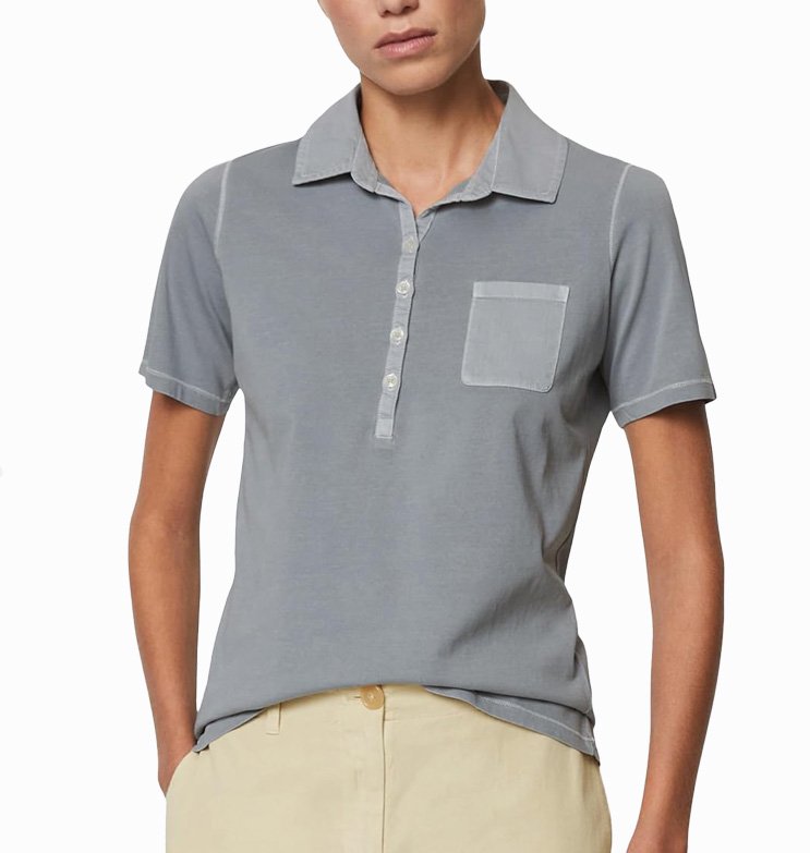 Mot. marškinėliai, pilkos spalvos, trumpomis rankovėmis, Polo stiliaus apykaklė, kišenė ant krūtinės, tiesus kirpimas.