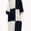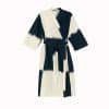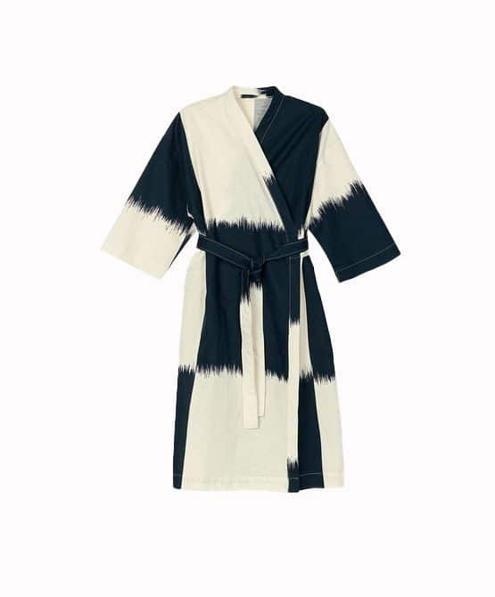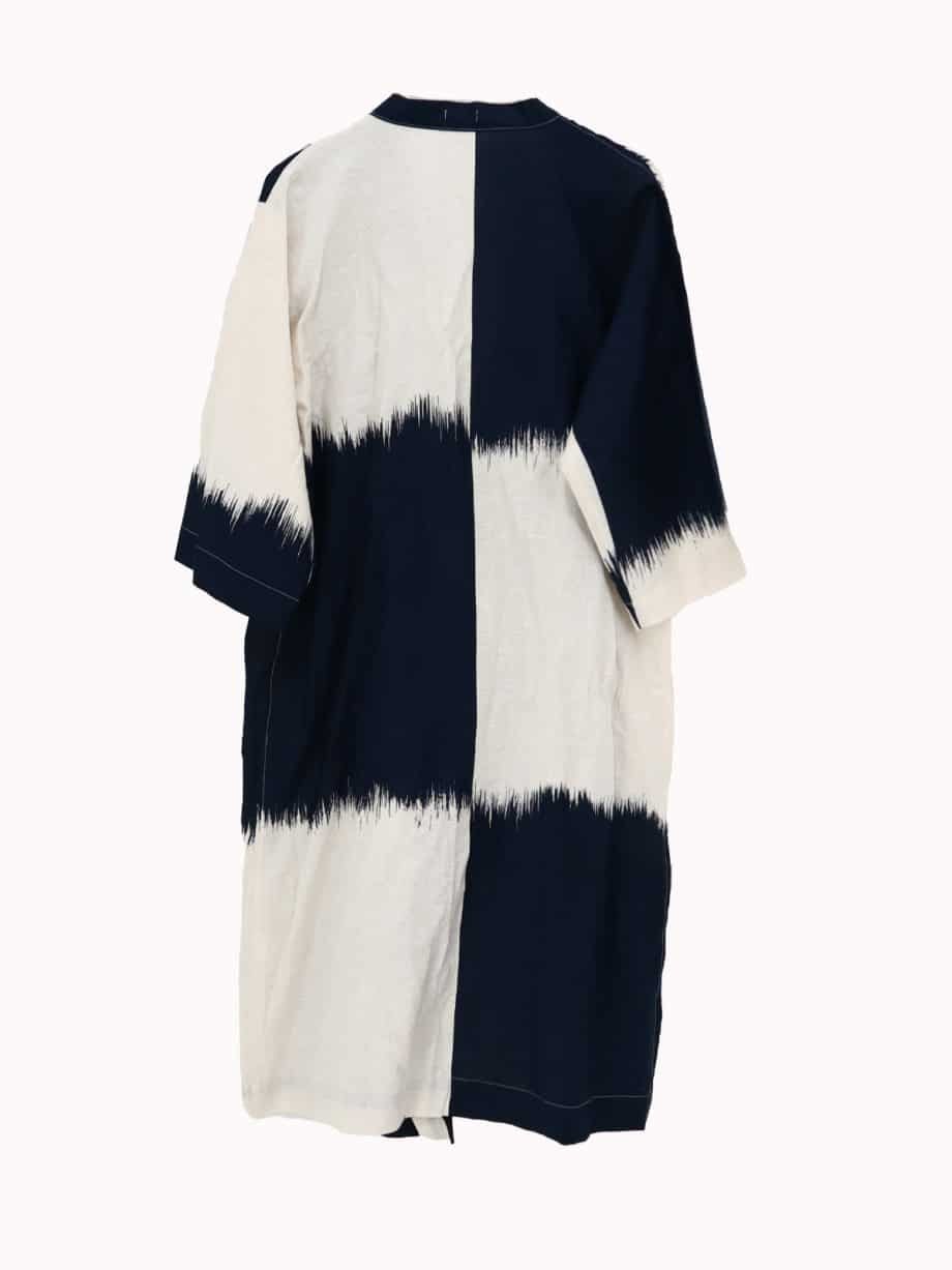 Mot. kimono, mėlynos/ smėlio spalvos, ilgas, 3/4 rankovės, prisūtas diržas, V formos iškirptė.