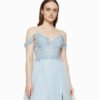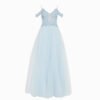 Mot. vakarinė suknelė, žydros spalvos, gili V formos iškirptė, siauros šleikutės, atvira nugara, užsegimas užtrauktuku, tiulio sijonas.
