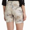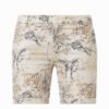Mot. šortai, smėlio spalvos, tiesaus kirpimo, gyvūno raštas, užsegimas užtrauktuku ir sagute, diržo kilpos, šoninės kišenės.