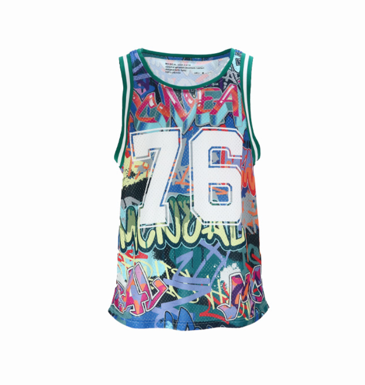 Vyr. sportiniai marškinėliai, be rankovių, apvali iškirptė, grafiti stiliaus raštai.