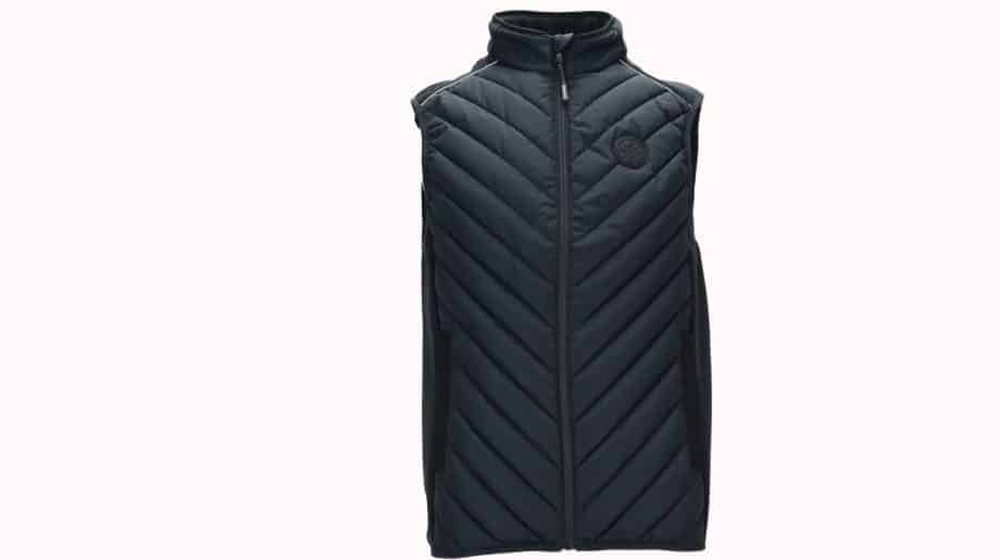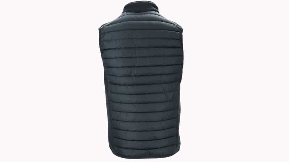 Vyr. liemenė, juodos spalvos, tiesaus kirpimo, stati apykaklė, užsegimas užtrauktuku, be rankovių.