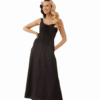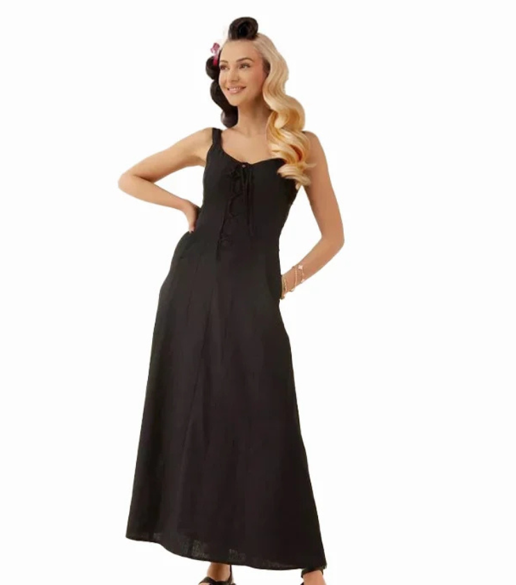 Mot. suknelė, juodos spalvos, kvadratinė kaklo iškirptė, storos petnešėlės, užsegimas užtrauktuku, šoninės kišenės, midi ilgis.