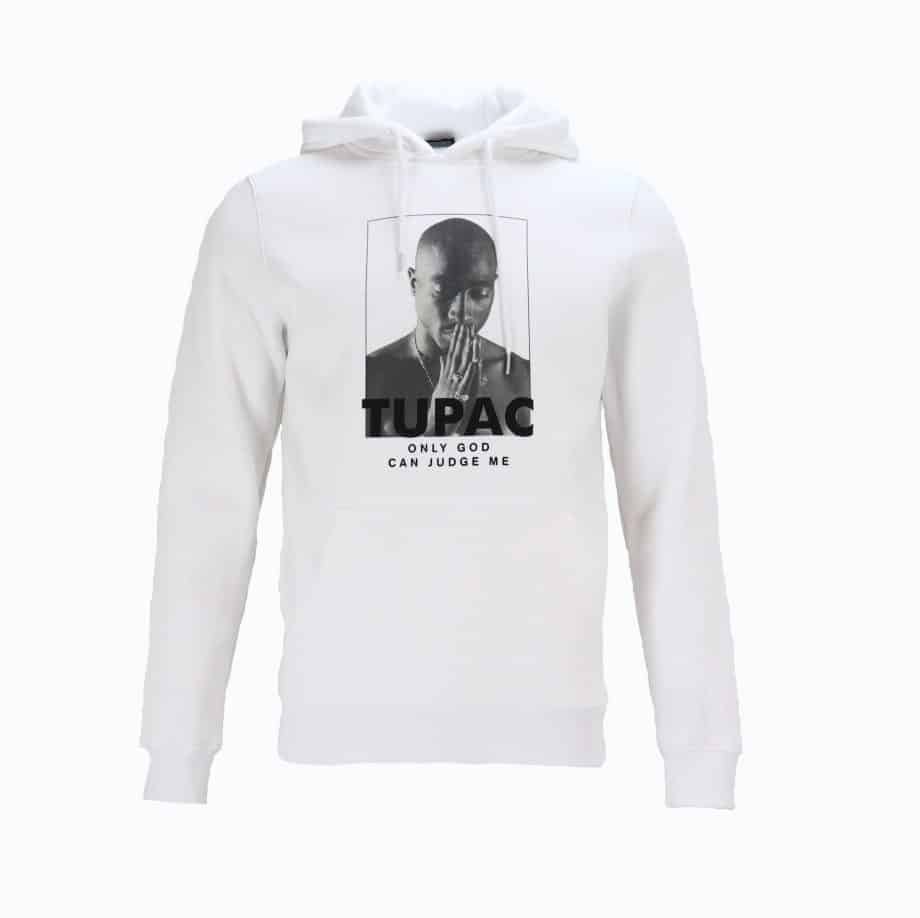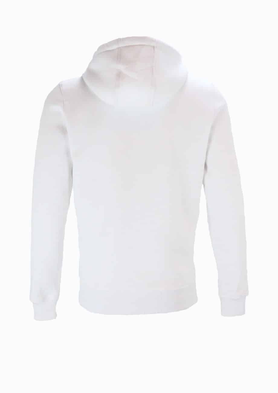 Vyr. džemperis, baltos spalvos, ilgomis rankovėmis, tiesaus kirpimo, gaubtas su raišteliais, logotipas, kišenė.