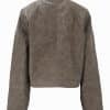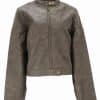 Mot. dirbtinės odos striukė, vintažinė ruda spalva, ilgomis rankovėmis, juostinė apykaklė, užtrauktukas, vienspalvė, tiesaus kirpimo.