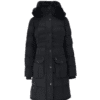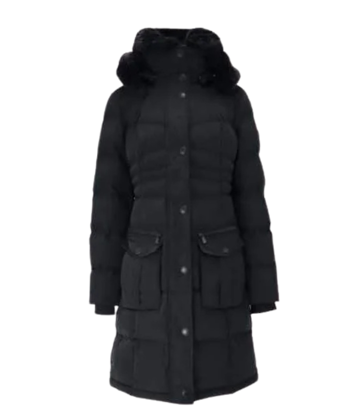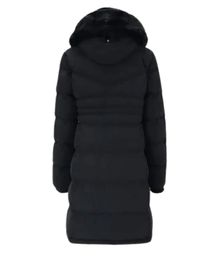 Mot. striukė, juodos spalvos, ilgomis rankovėmis, su gobtuvu, šoninės kišenės, megzti rankogaliai, gaubtas reguliuojamas ir nuimamas, dviejų krypčių užtrauktukas, nuimamas kailis, reguliuojamas juosmens dydis, su dirželiu, atspari vandeniui ir vėjui.