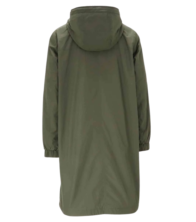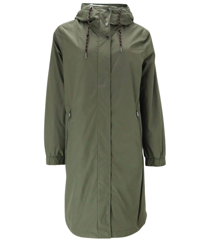 Mot. striukė, chaki spalvos, su šoninėmis kišenėmis, užtraukiama užtrauktuku, tiesus kirpimas, gaubtas su raišteliais , šoninės kišenės.