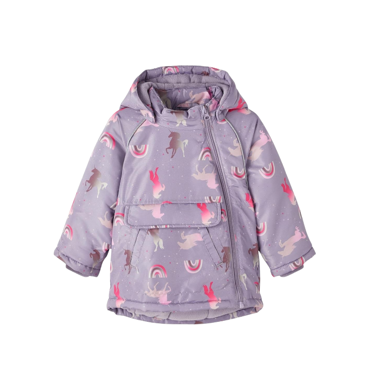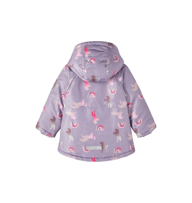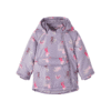 Vaik. striukė, violetinės spalvos, ilgomis rankovėmis, nuimamas gobtuvas, spausdintas raštas, užsegimas užtrauktuku, kengūros tipo kišenė.