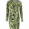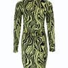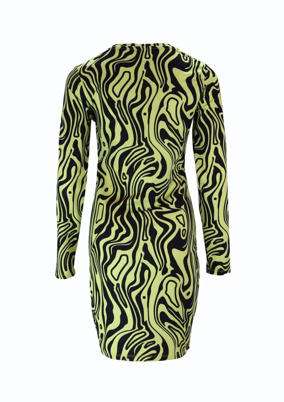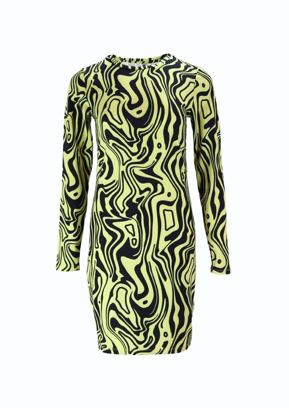 Mot. NEON & NYLON mini suknelė ilgomis rankovėmis, geltonu sukūriniu atspaudu. Žaliosios citrinos spalva suknelė. Apskrita kaklo iškirptė. Dygsniuotas apvadas / kraštas Kaklo juosta Pilnai raštuota To paties tono atspalvių siūlės Lygi medžiaga