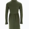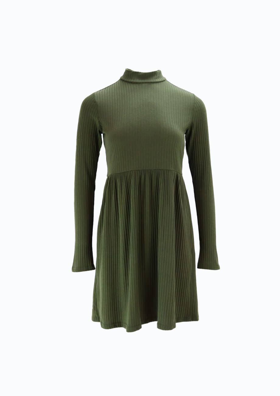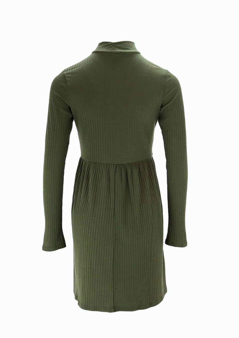 Mot. suknelė, tamsios chaki spalvos, ilgomis rankovėmis, stati apykaklė,paprastas spalvos dizainas, be užsegimo, mini ilgis.