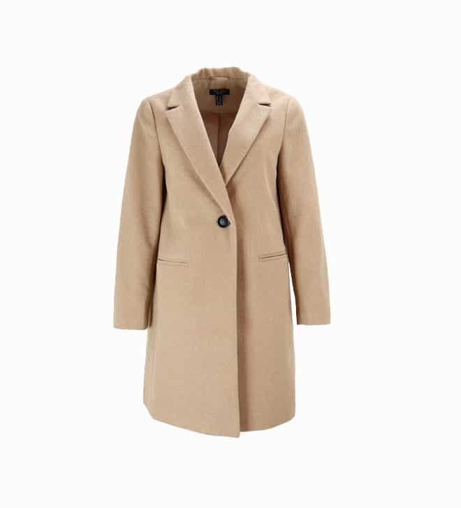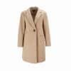 Mot. paltas, kreminės spalvos, ilgomis rankovėmis, revere apykaklė, užsegimas viena saga, ilgas apvadas, tiesus kirpimas, ilgis iki kelių.