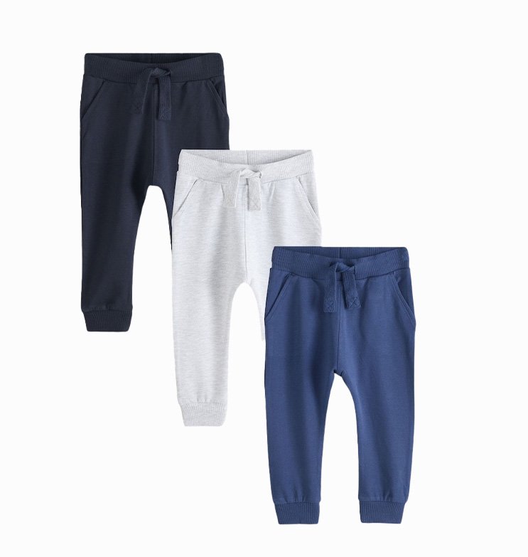 Vaik. laisvalaikio kelnės, tamsiai mėlynos/ mėlynos/ pilkos spalvos, elastingas juosmuo, šoninės kišenės, siaurėjančio kirpimo, liemuo reguliuojamas raišteliais.