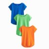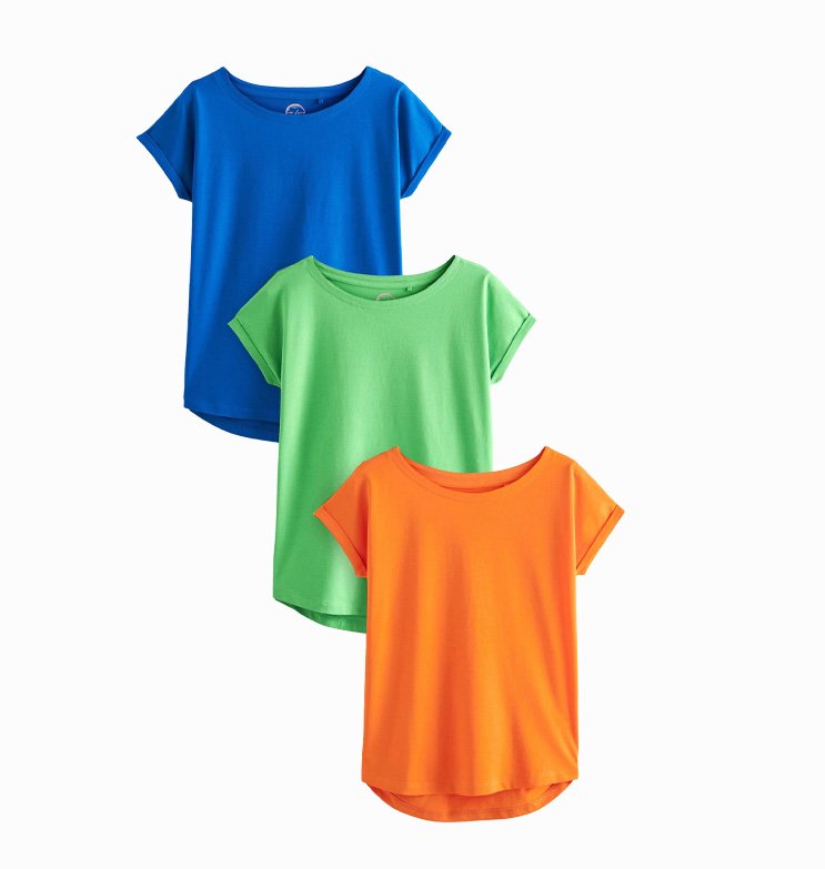 Mot. marškinėliai, oranžinės/ žalios/ mėlynos spalvos, trumpomis rankovėmis, apvali kaklo iškirptė, vienspalvio rašto, tiesaus kirpimo. Pakuotėje 3vnt. marškinėliu.