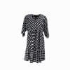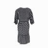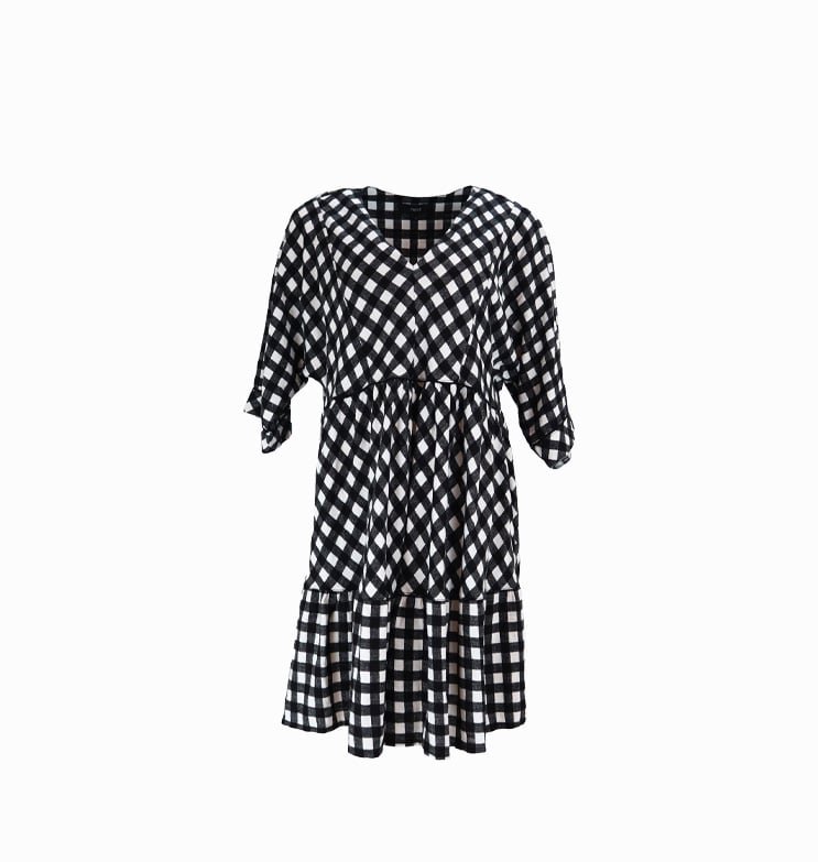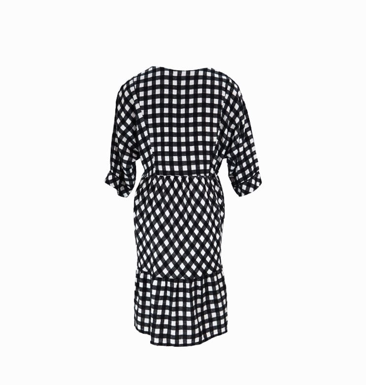 Mot. suknelė, juodos/ baltos spalvos, languoto rašto, 3/4 rankovės, V formos iškiprtė, laisvo kirpimo.