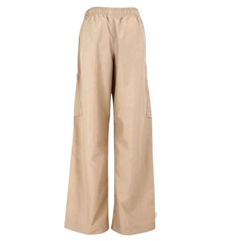 Mot. kareiviško stiliaus kelnės, smėlio spalvos, ilgos, platus kirpimas, aukštas juosmuo, didelė kišenė, soninės kišenės, elastingas juosmuo.