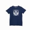 Vaik. marškinėliai, tamsiai mėlynos spalvos, trumpomis rankovėmis, apvali iškirptė, tiesaus kirpimo, logotipo spauda.
