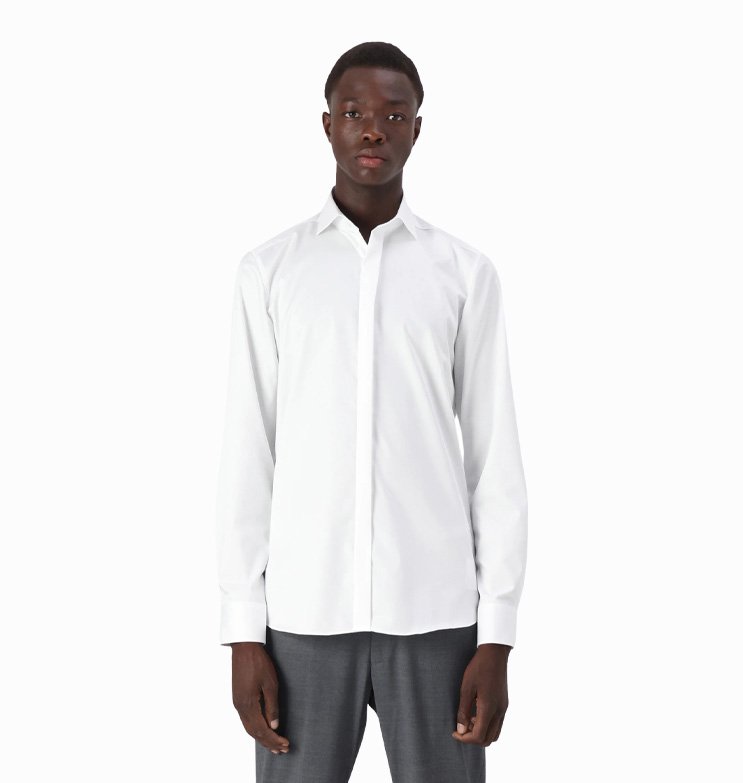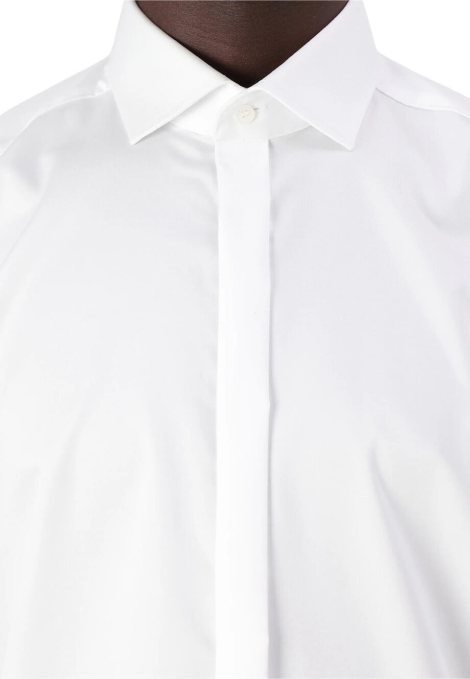 Vyr. marškiniai, baltos spalvos, ilgomis rankovėmis, kento apykaklė, užsegimas per visą ilgį.