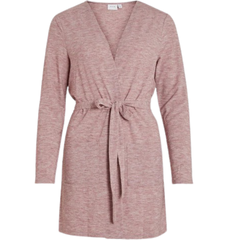 Mot. kardiganas, rožinės spalvos, ilgomis rankovėmis, be užsegimo, rankų kišenės, surišama dirželiu per liemenį.