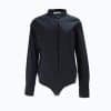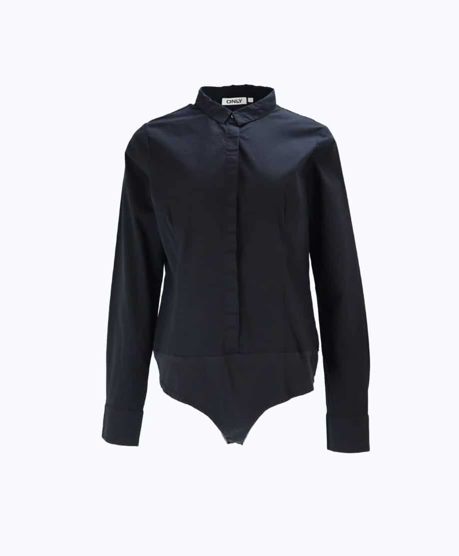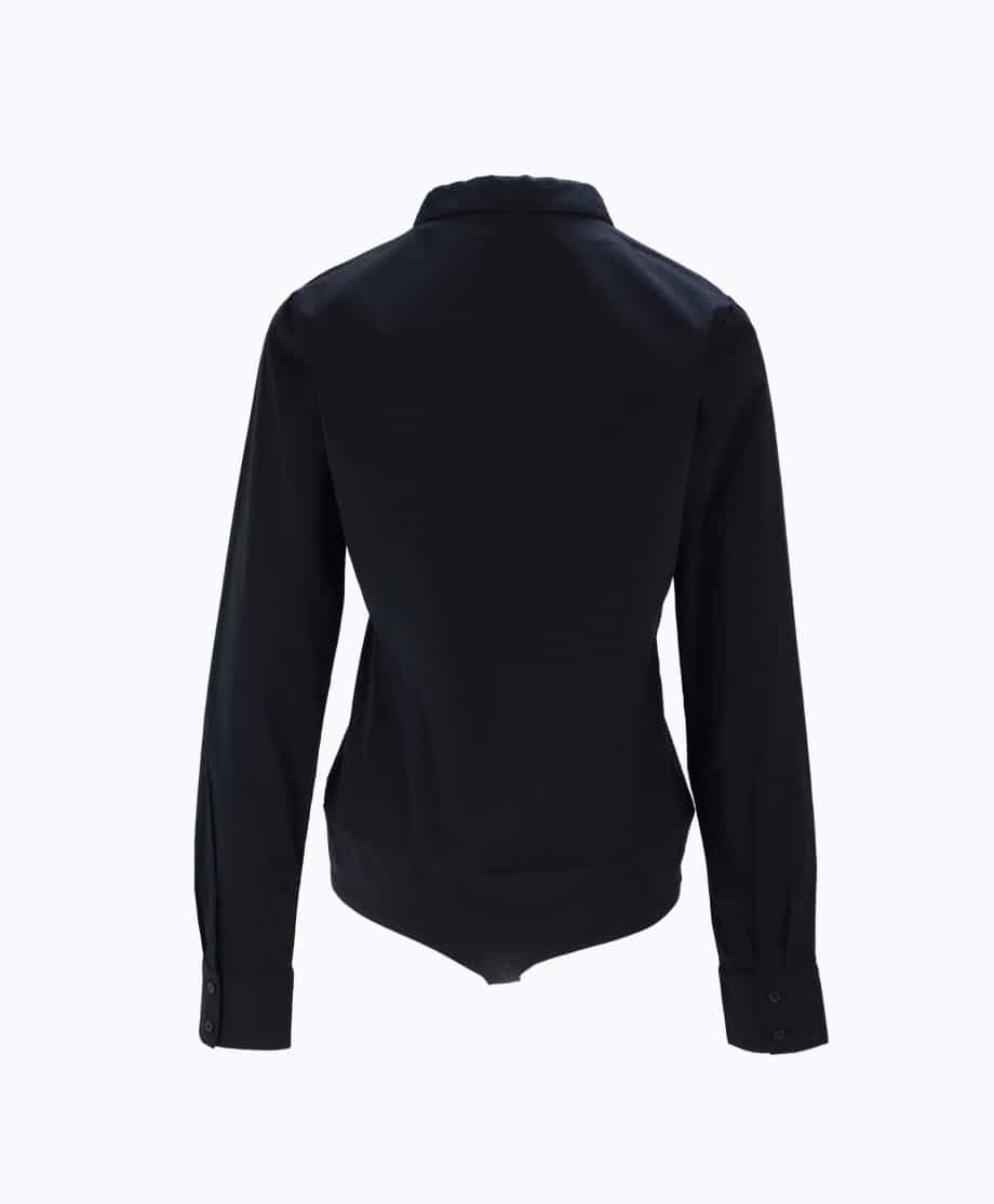 Mot. marškiniai- glaustinukė, juodos spalvos, užsegimas sagomis ir apačioje spaudėmis, ilgos rankovės, atlenkiama apykaklė.