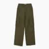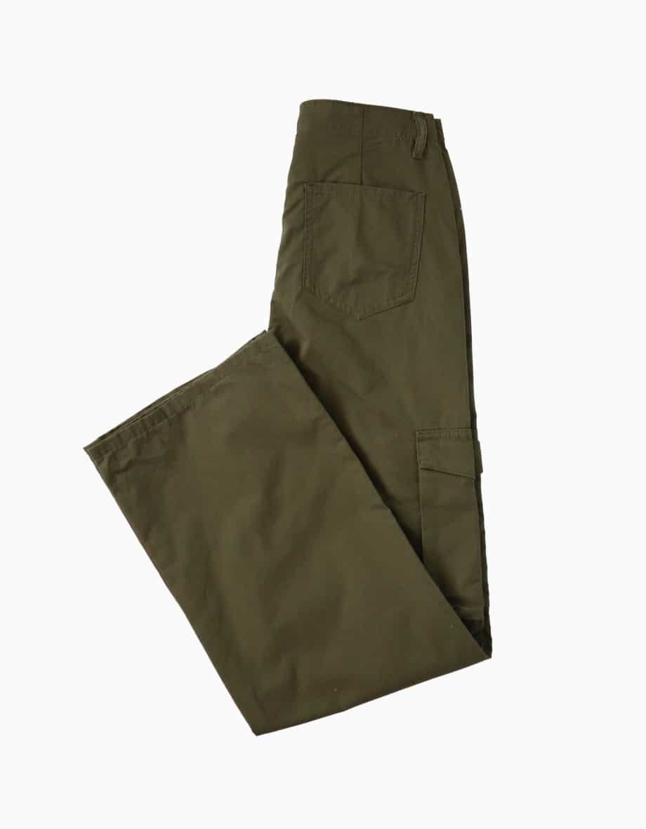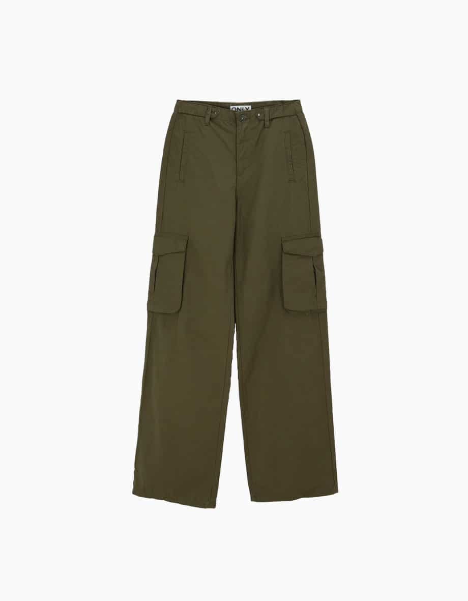 Mot. kelnės, chaki spalvos, Cargo stiliaus, šoninės kišenės, užsegimas užtrauktuku ir sagute, platėjančio kirpimo.