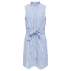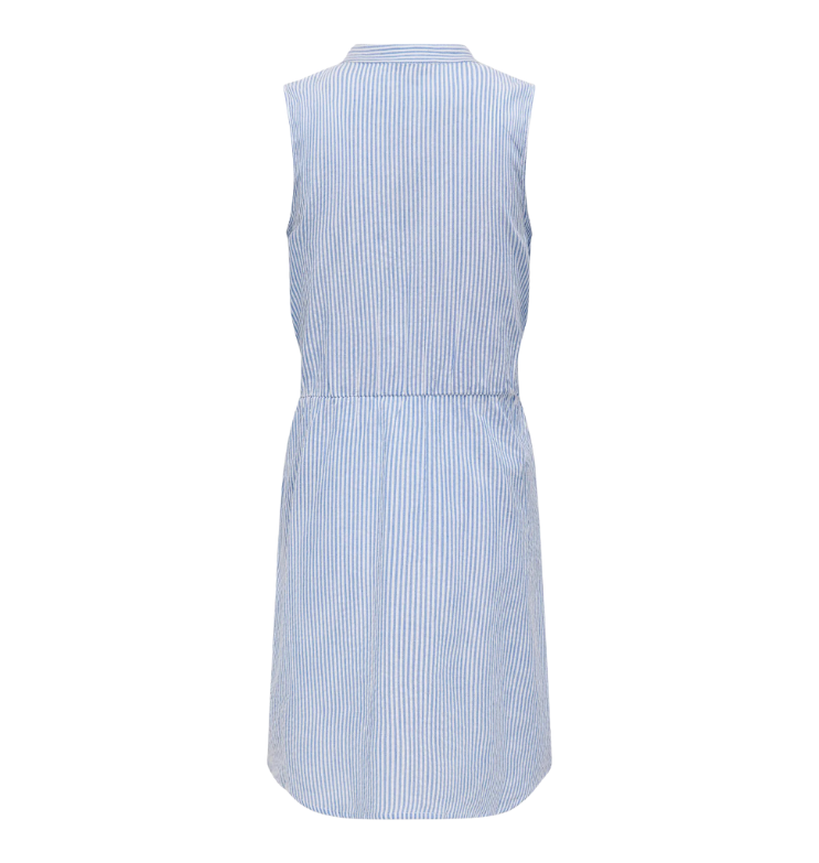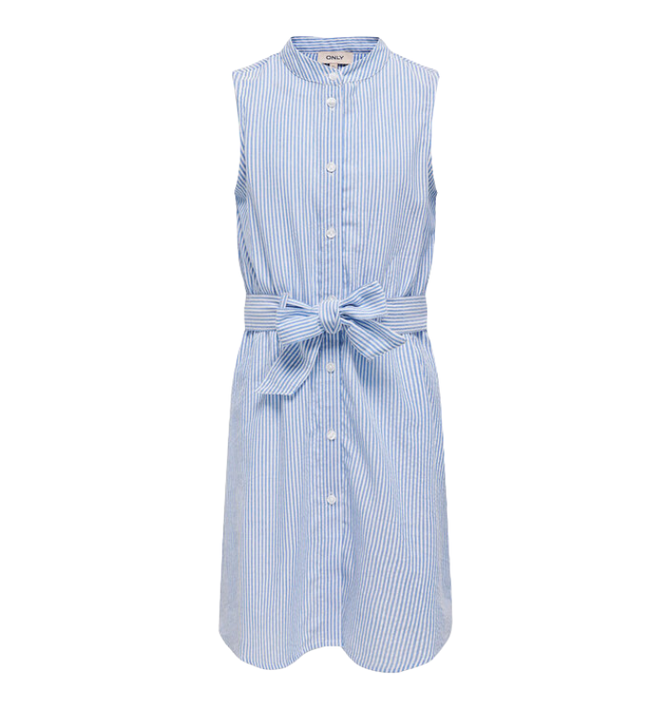 Vaik. suknelė, žydros spalvos, be rankovių, dryžuotas raštas,užsegimas sagomis, juosmens dirželis.