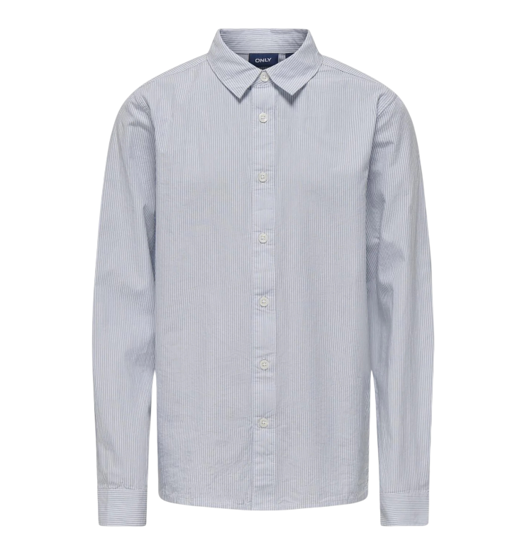Vaik. marškiniai, šviesiai mėlynos spalvos, ilgomis rankovėmis, kento apykaklė, užsegimas per visą ilgį.