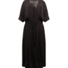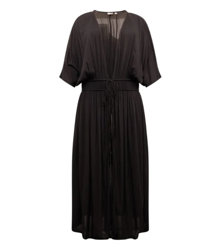 Mot. kimono stiliaus suknelė, juodos spalvos, laisvo kirpimo, ilga ir turi trijų ketvirčių rankoves.