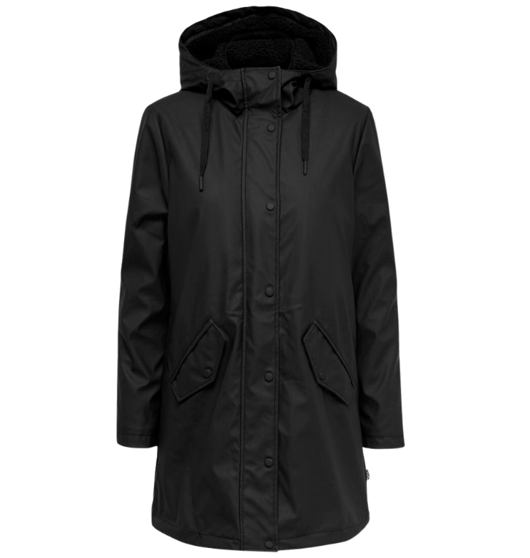 Mot. striukė, juodos spalvos, ilgomis rankovėmis, su gobtuvu, priekyje kišenės, užsegimas užtrauktuku per visą ilgį.