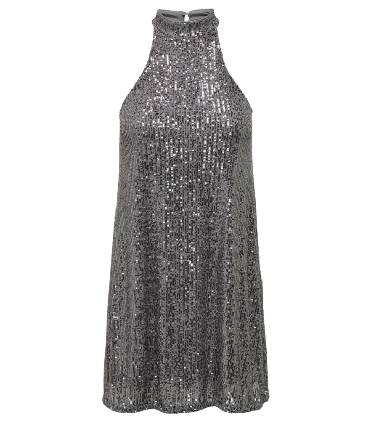 Mot. blizgi suknelė, pilkos spalvos, be rankovių.