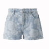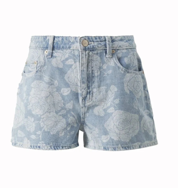 Mot. džinsiniai šortai, žydros spalvos, aukštas liemuo, 5 kišenių dizainas, užsegimas sagute ir užtrauktuku, gėlėto rašto, trumpi.