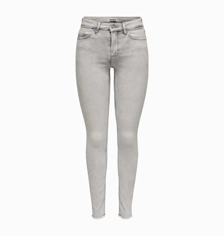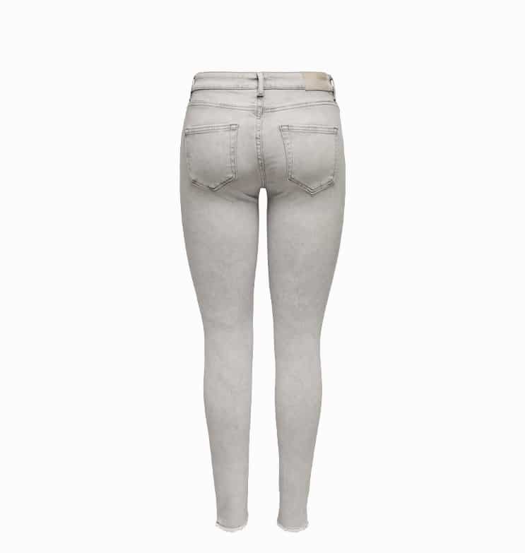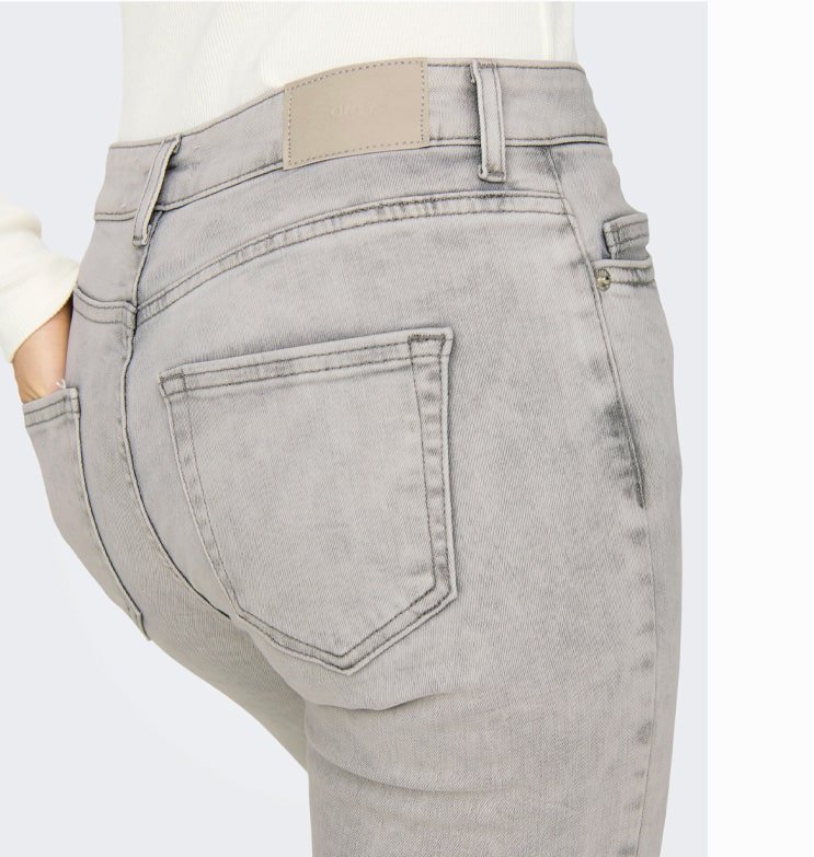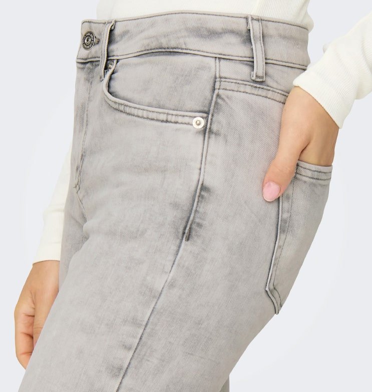 Mot. džinsai, šviesiai pilkos spalvos, penkių kišenių dizainas, užsegimas užtrauktuku saga.