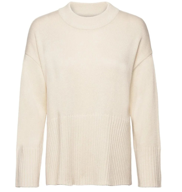 Mot. megztinis, smėlio spalvos, ilgomis rankovėmis, apvali kaklo iškirptė, megztas raštas.