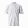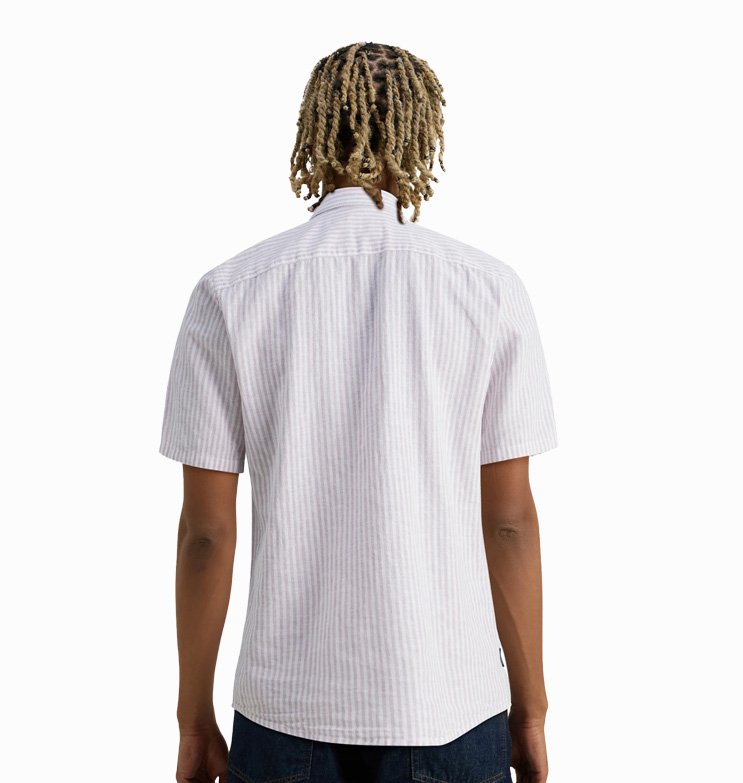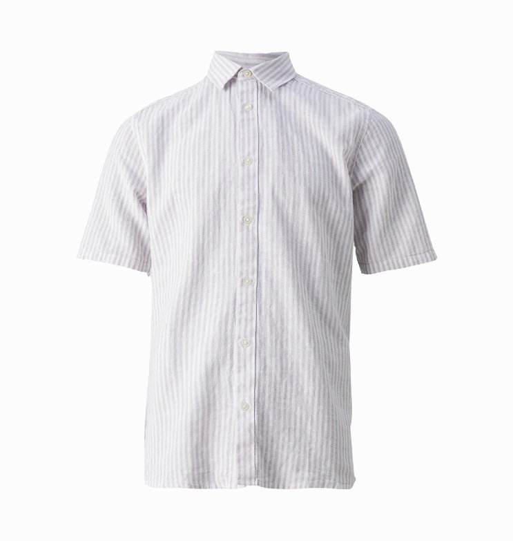 Vyr. marškiniai, šviesiai rožinės spalvos, dryžuotas raštas, kento apykaklė, trumpomis rankovėmis, užsegimas per visą ilgį.