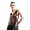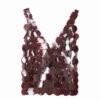 Mot. palaidinė- viršus, tamsios vyšninės spalvos, gili V formos kaklo iškirptė, be rankovių, permatoma, užsegimas spaudėmis, atvira nugara.