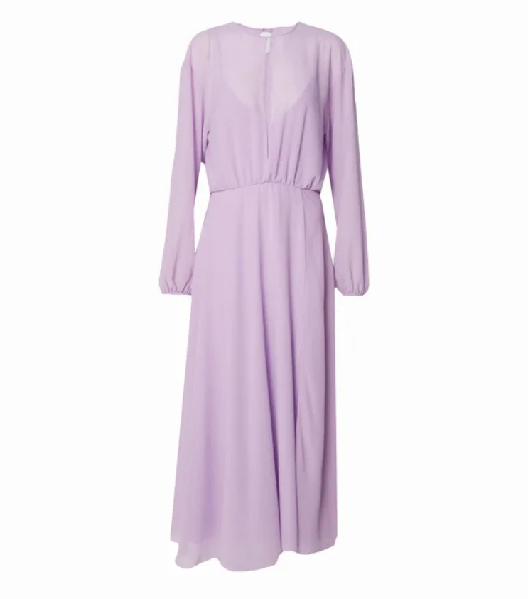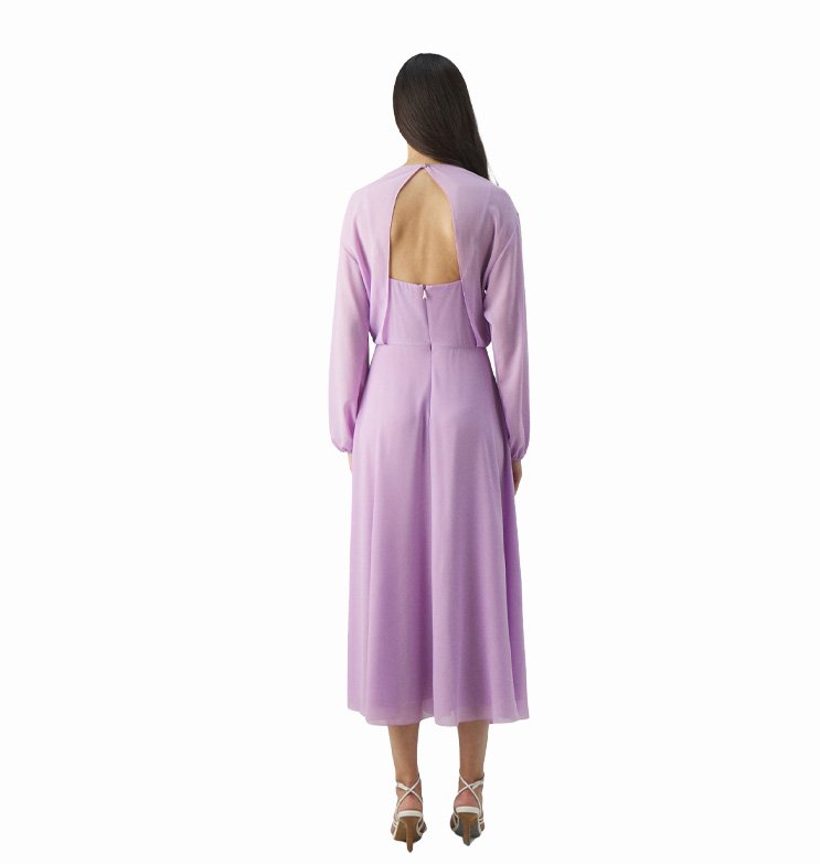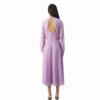 Mot. suknelė, violetinės spalvos, ilgomis rankovėmis, apvali kaklo iškirptė, atvira nugara, užsegimas užtrauktuku, laisvo stiliaus, elegantiška