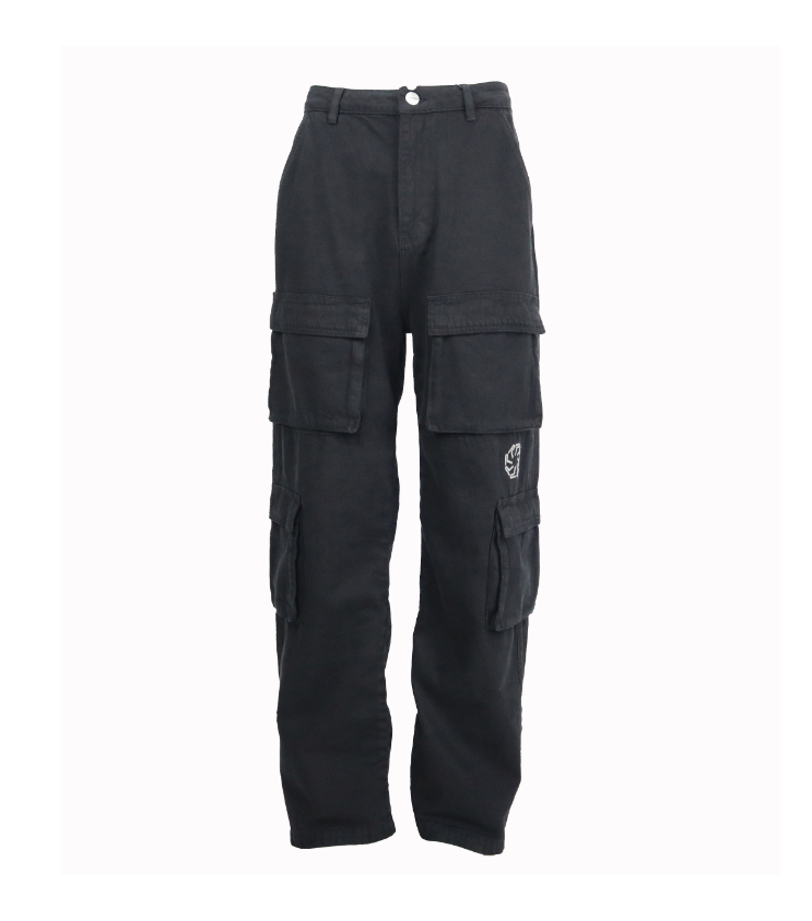 Vyr. džinsai, juodos spalvos, plataus kirpimo, siluetas tiesus, ilgos, kišenės šoninės, logo išsiuvinėtas.