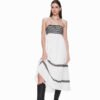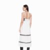 Mot. suknelė, baltos spalvos, be rankovių, atvira nugara, surišamos petnešos, juodos spalvos raštai, midi ilgis.