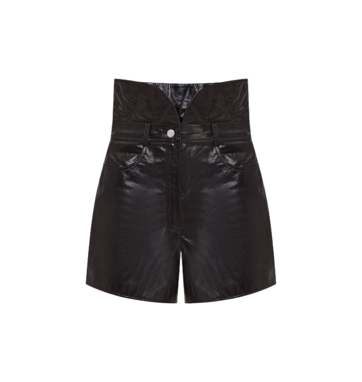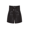 Mot. šortai, tamsiai rudos spalvos, aukštas liemuo, šoninės ir užpakalinės kišenės, diržo kilpos.