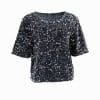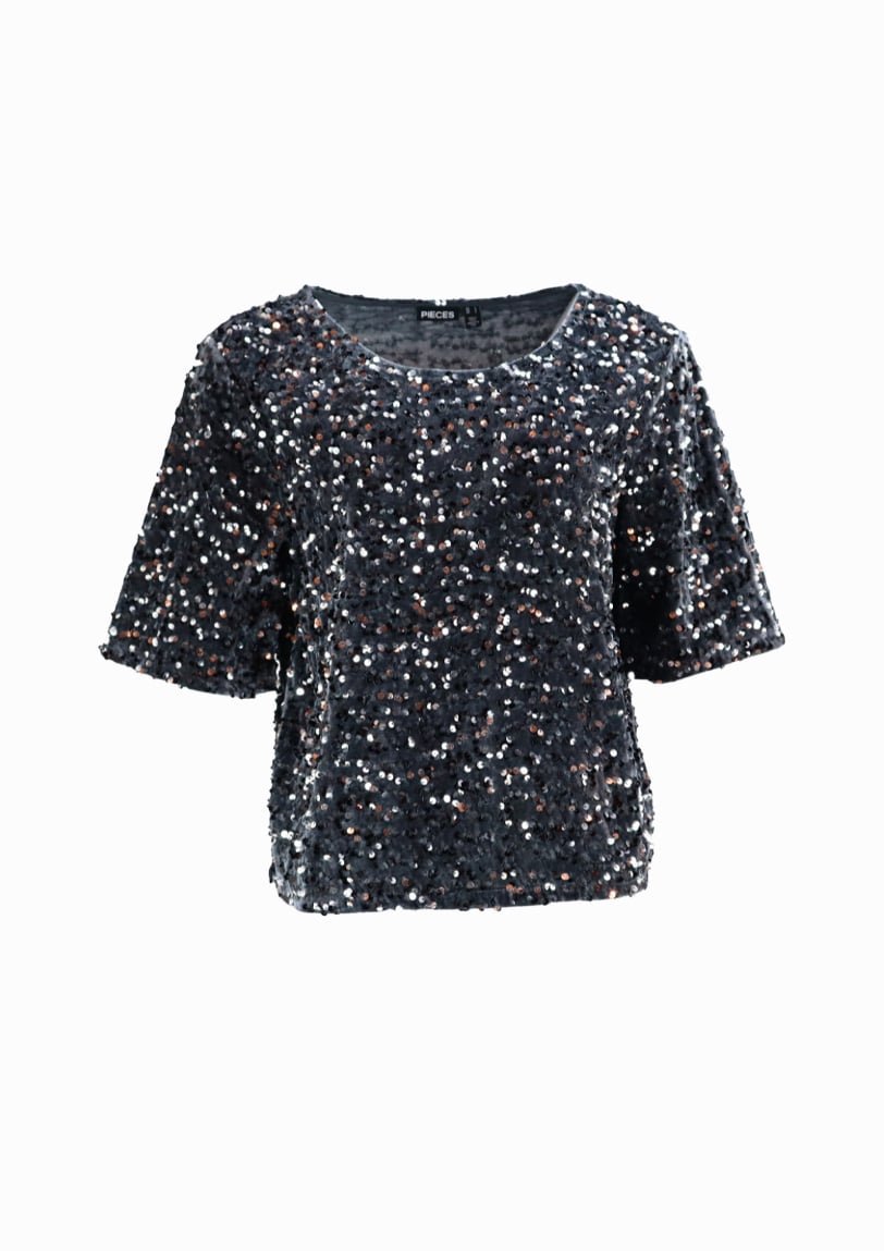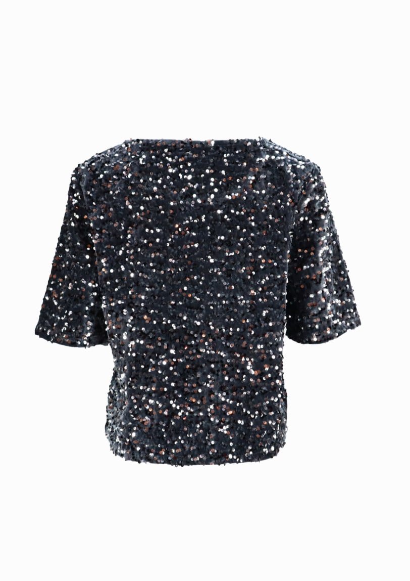 Mot. palaidinė, tamsiai pilkos spalvos, apvali iškirptė, trumpos rankovės, blizgi.