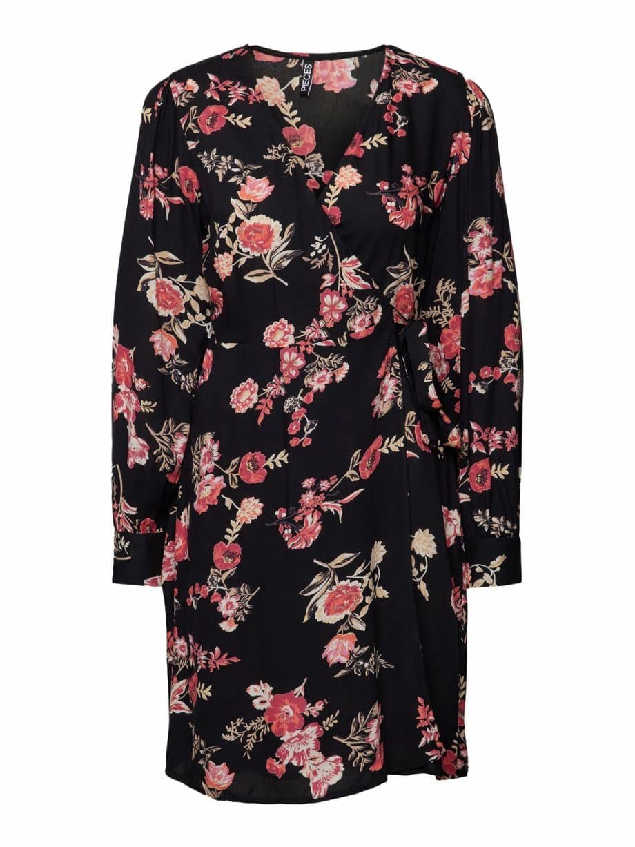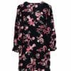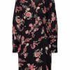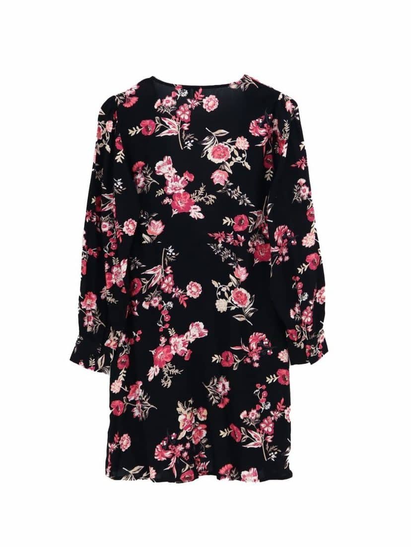 Mot. suknelė, juodos spalvos, gėlių rašto, ilgomis rankovėmis, susiaučiama, V formos iškirptė.