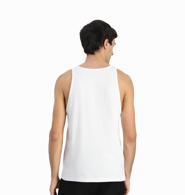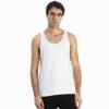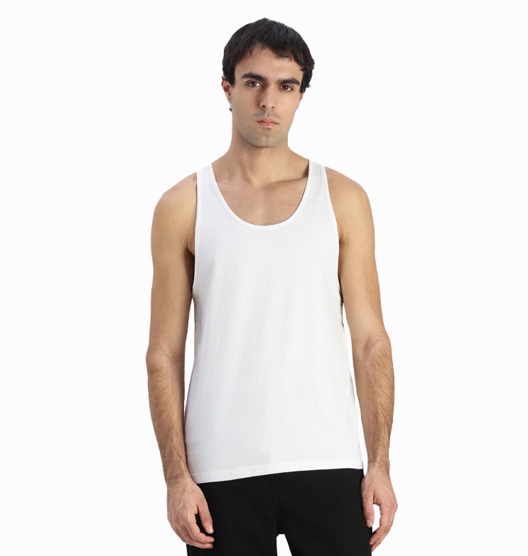Vyr. marškinėliai, baltos spalvos, gili apvali iškirptė, tiesaus kirpimo, be rankovių.