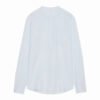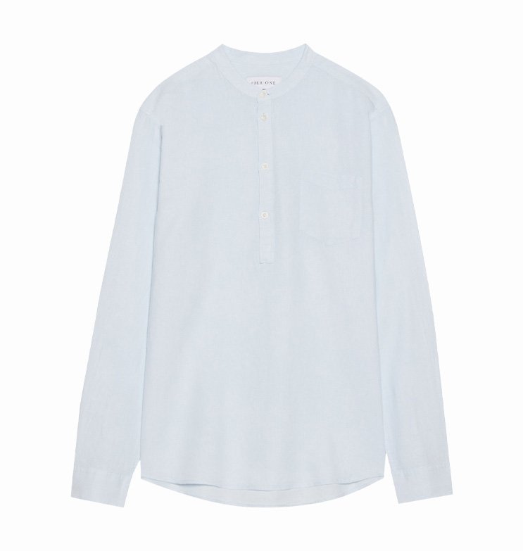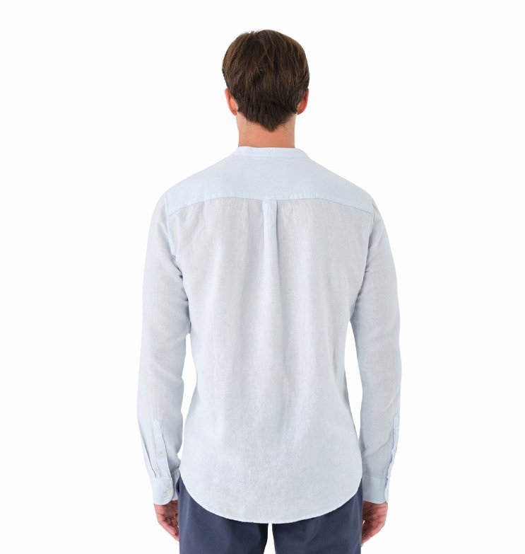 Vyr. marškiniai, žydros spalvos, juostinė apykaklė, užsegimas sagomis, ilgos rankovės, kišenė ant krūtinės, tiesaus kirpimo, vienspalvis raštas.