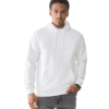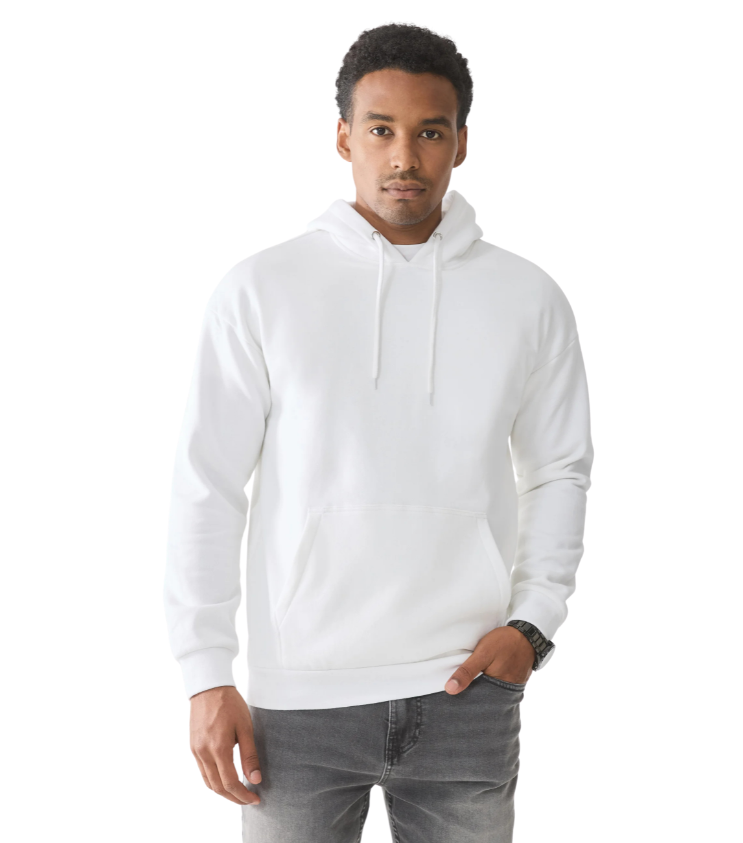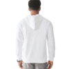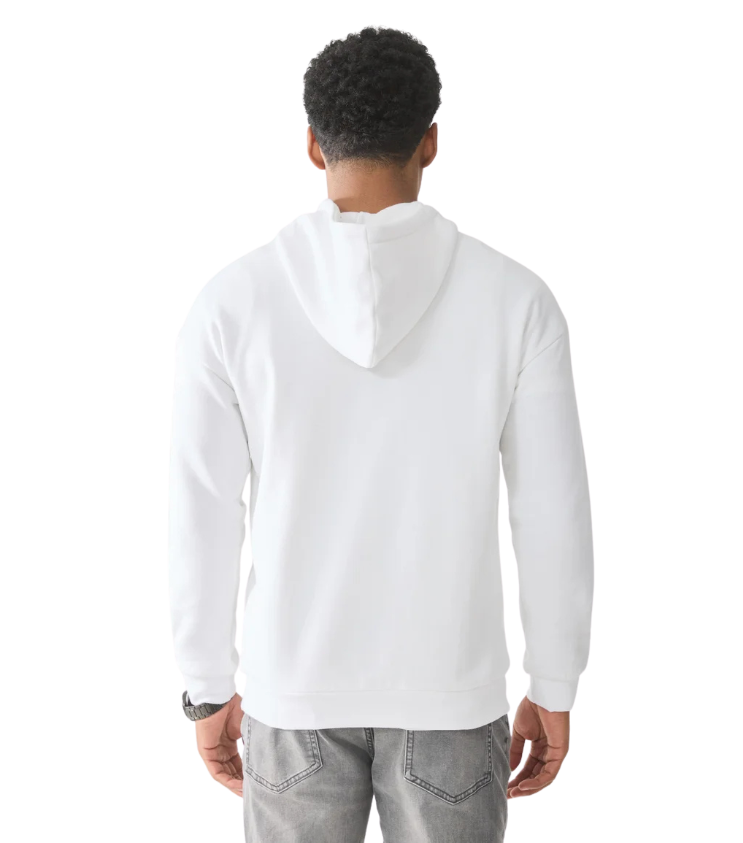 Vyr. džemperis, baltos spalvos, su gobtuvu, movinė kišenė, elastingas juosmuo, tiesaus kirpimo.