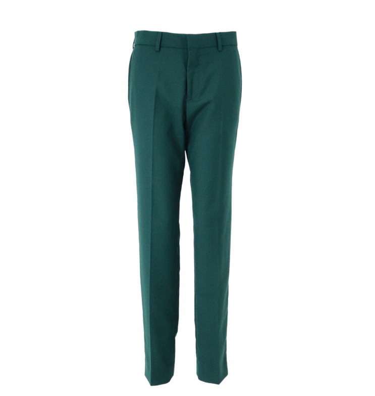 Vyr. kostiuminės kelnės, žalios spalvos, šoninės kišenės, tiesus kirpimas, diržo kilpos, užsegimas saga ir užtrauktuku.