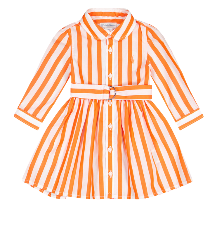Vaik. suknelė, oranžinės spalvos, ilgomis rankovėmis, užsegimas per visą ilgį, spausdintas logotipas, dryžuotas raštas.