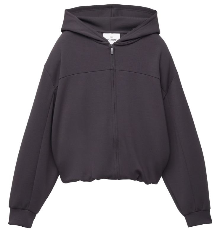 Mot,tamsiai pilkos spalvos džemperis su gobtuvu. Užsitraukia užtrauktuku. Šonuose turi kišenes.